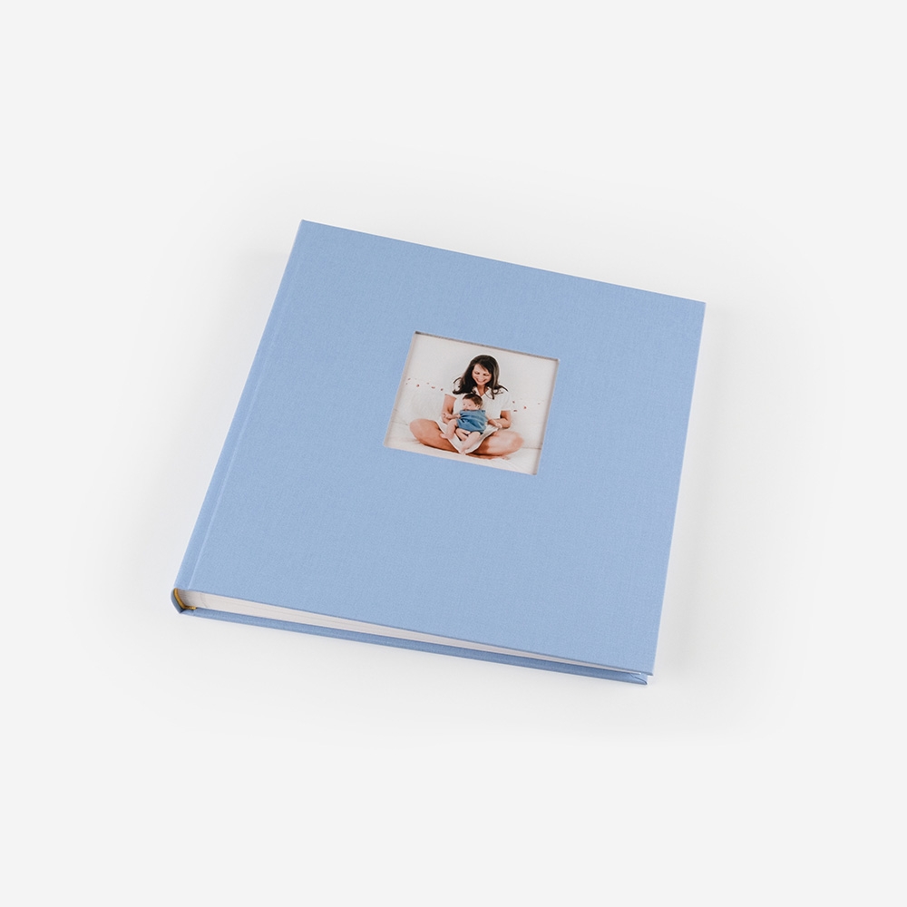 A capa em Linho dos Álbuns Analógicos com janela apresenta uma abertura para destacar uma fotografia de 10x15cm. Disponível em sete cores: azul, bege, cinza, rosa, castanho, mostarda e verde.