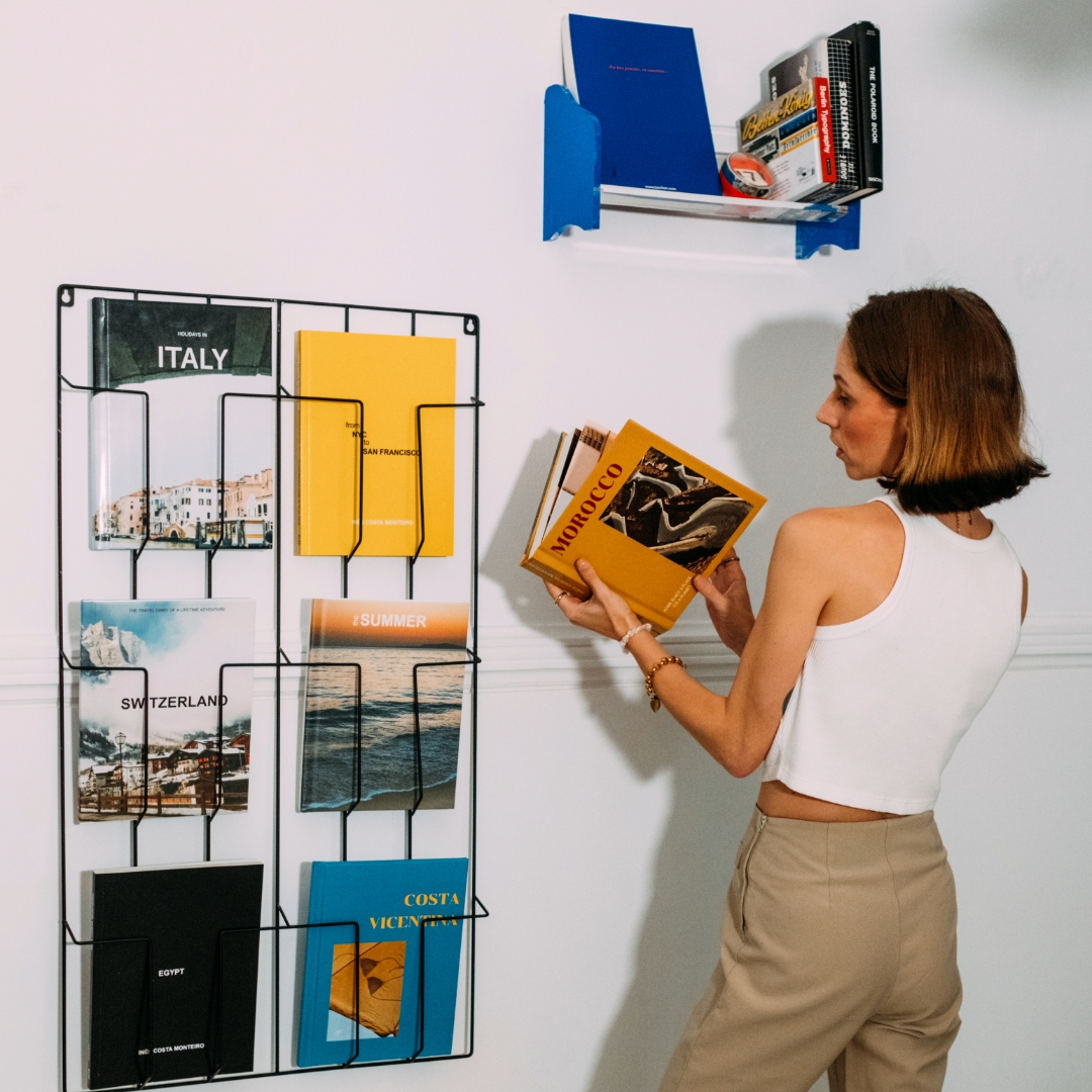 Dica extra: Usa suportes de livros para manter os álbuns em pé e bem visíveis.