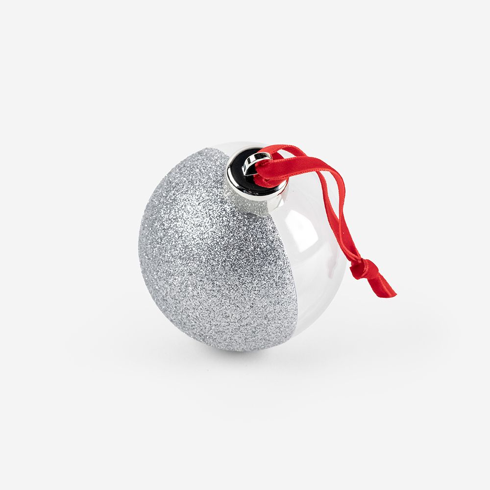 A Bola de Natal é composta por uma estrutura em plástico transparente e possui no seu interior 2 fotografias. Está disponível em duas cores: Dourado e Prateado.